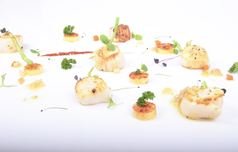Vieires i patata al pebre vermell saltades amb vinagreta de fonoll i porros.