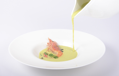 Crema de pèsols baby, ceba, porros i crema de llet amb llagostí.