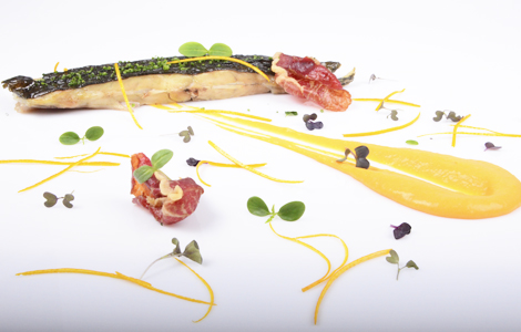 Turbot amb puré de carbassa i cruixent de pernil ibèric.